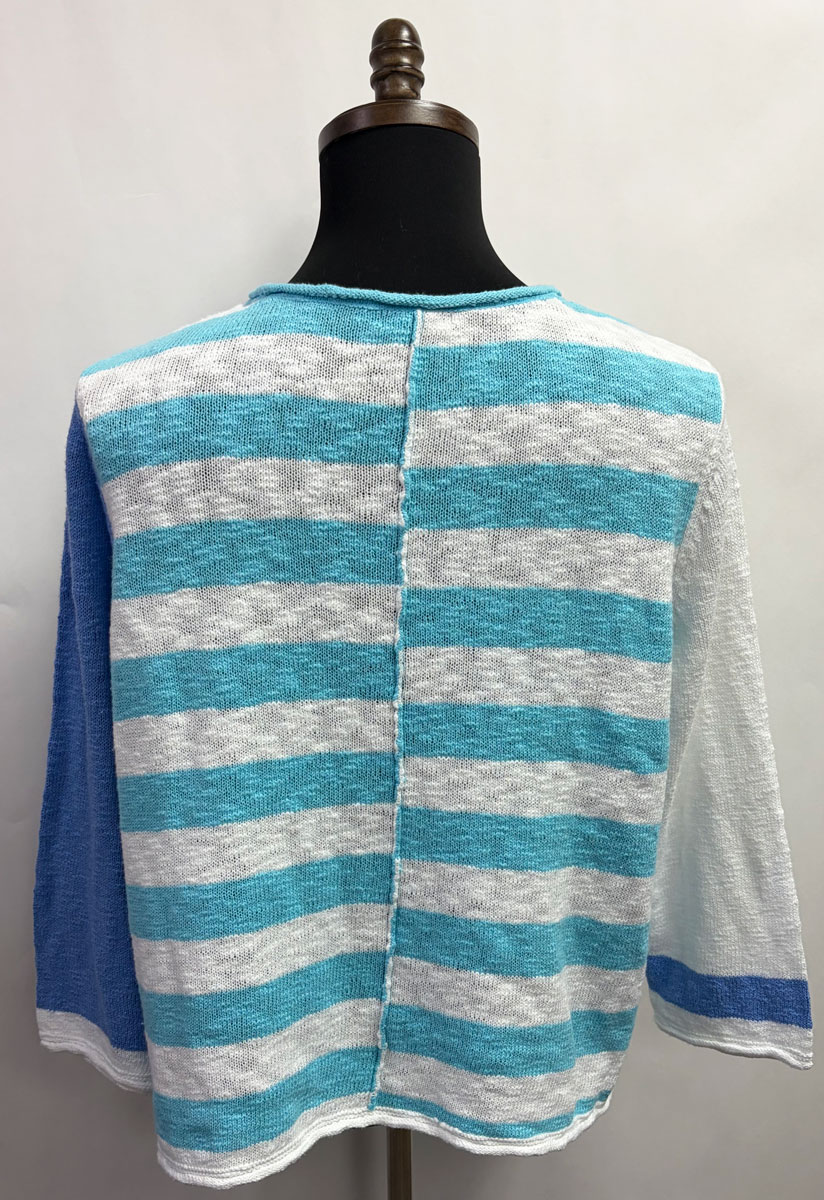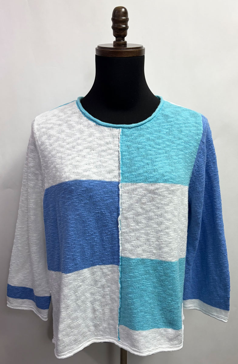 Habitat ~ Yin Yang Patchwork Topaz Cotton Sweater #A24T11 100% Cotton Slub Spring Sweater Round roll neckline Marine blue, aqua and white patchwork Perfect light spring sweater layer Regular length 3/4 Sleeves Fabric: 100% Cotton slub Hand wash, lay flat to dry Sizes: M-XL $99.95 #A24T11