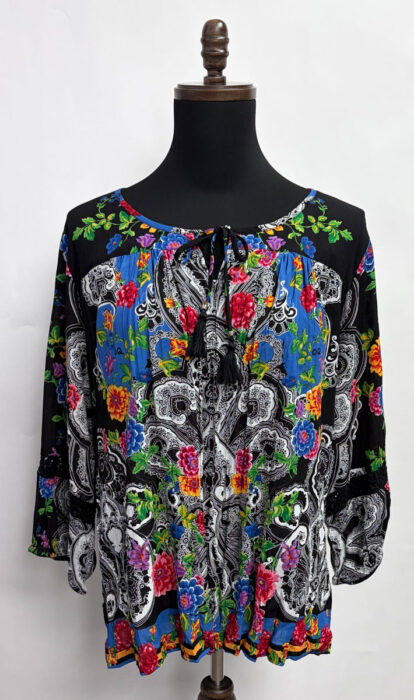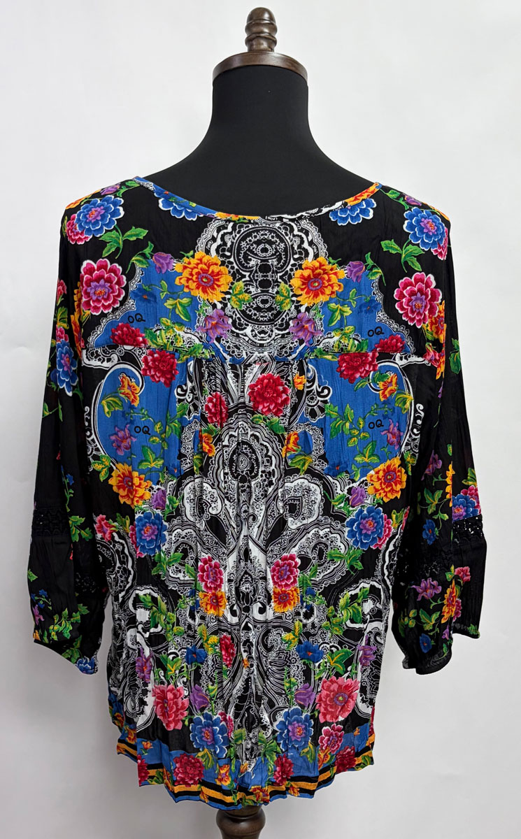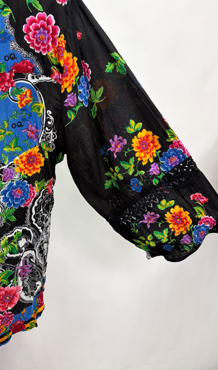 Generous 3/4 Sleeves with open weave lace detail and wide, soft elastic at cuff