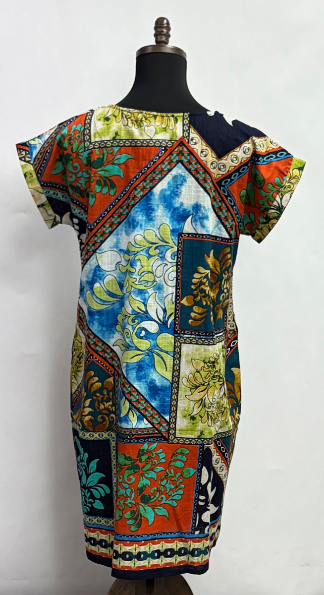 Orientique ~ “Cabo Fria” Certified Organic Cotton Dress #A62D3 Lightweight, Organic Cotton summer dress “Cabo Fria” print in bold hues Cap sleeves Round neckline Side seam pockets Fabric: 100% Certified Organic Cotton Gentle machine wash cold, tumble dry low Size: M-XL $89.95 #A62D3