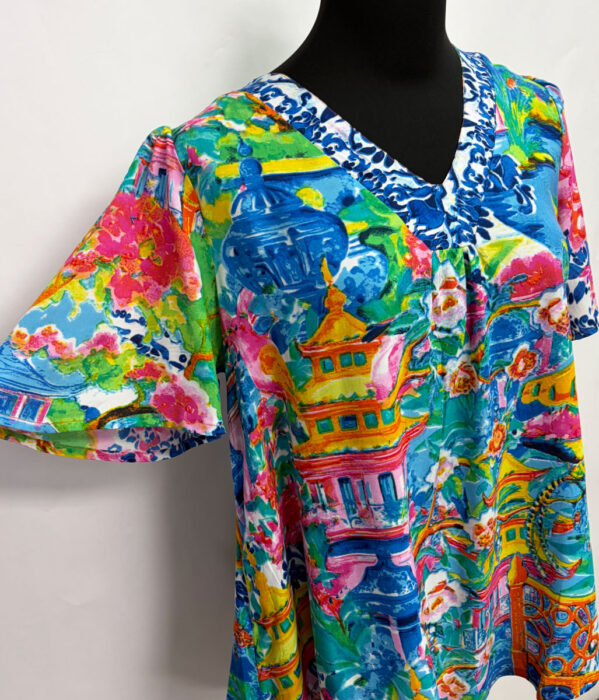 Orientique ~ “Okayama” Flair Sleeve, V-neck Top #A62T4 Lightweight, soft sustainable rayon summer shirt “Okayama” print in bright, colorful hues Flair sleeve – roomy feminine look V-neck Fabric: 100% Sustainable Rayon Gentle machine wash cold, tumble dry low Size: M-2X $79.95 #A62T4