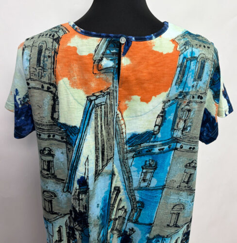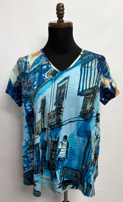 Orientique ~ ORGANIC COTTON Top, Blue Town Print #A62T1 Stand out in the crowd in this unique “Blue Town” print, ORGANIC COTTON top V-neckline with 1 button closure detail on back Regular length Short sleeves 100% Organic Cotton Machine wash cold, lay flat to dry Sizes: M-2X $59.95 #A62T1