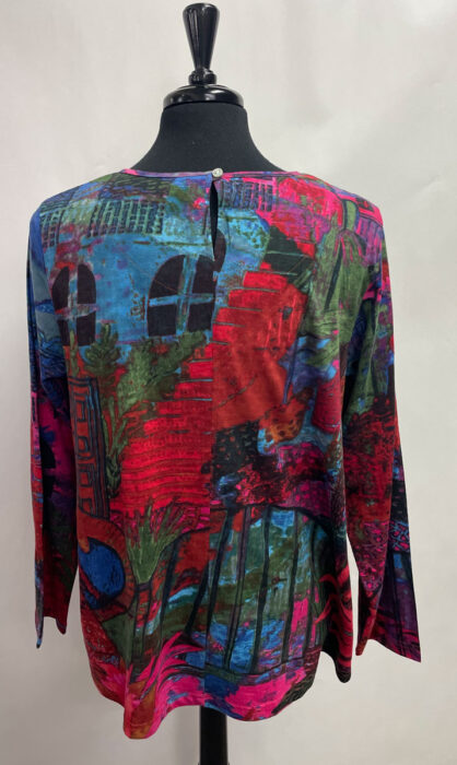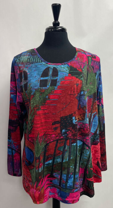 Orientique ~ ORGANIC COTTON Top, Houses Print #ZF62T4 Stand out in the crowd in this unique Houses print, ORGANIC COTTON top Round neckline with 1 button detail on back Regular length Long sleeves 100% Organic Cotton Machine wash cold, lay flat to dry Sizes: L-2X $59.95 #ZF62T4