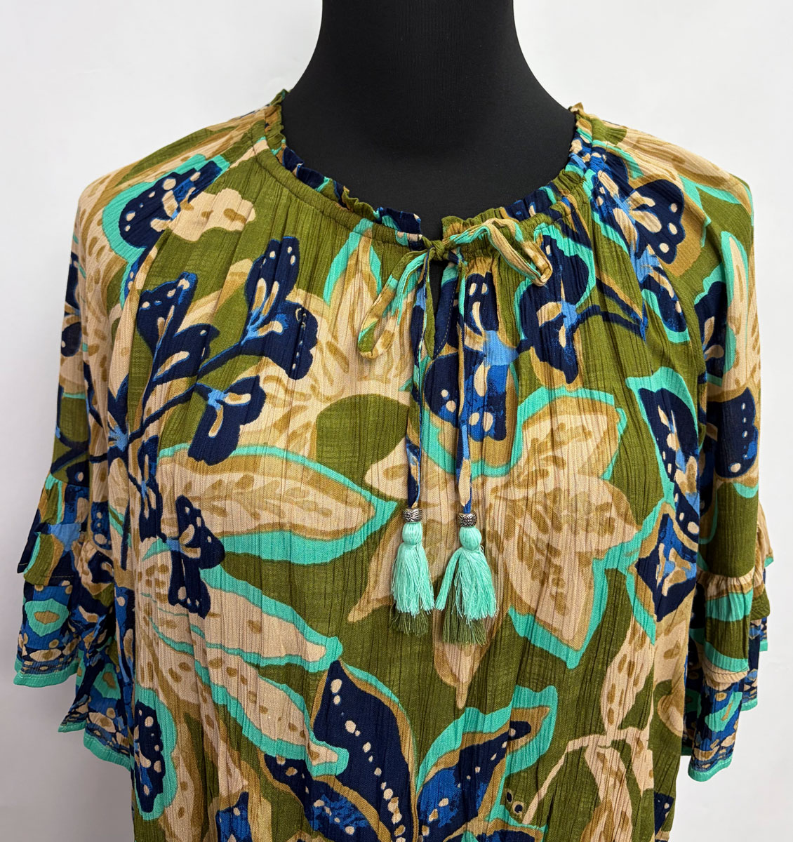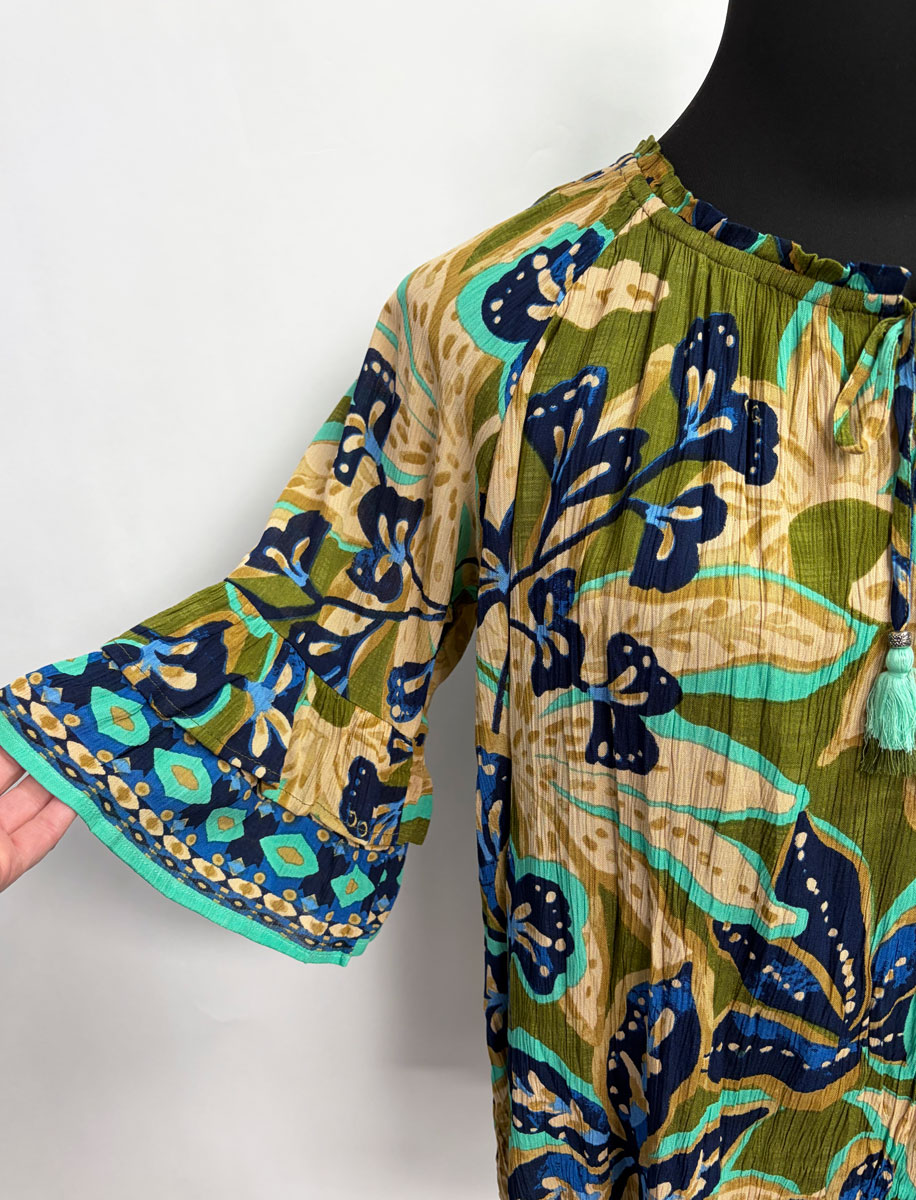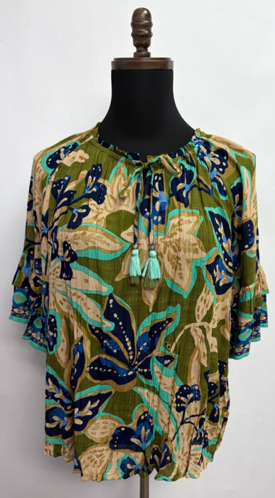 Orientique ~ Playa Brava Top with Frill Sleeve #A62T7 Lightweight, sustainable rayon summer shirt “Playa Brava” print Frill sleeve – roomy feminine look Drawstring scoop neckline Fabric: 100% Sustainable Rayon Gentle machine wash cold, tumble dry low Size: M-2X $79.95 #A62T7