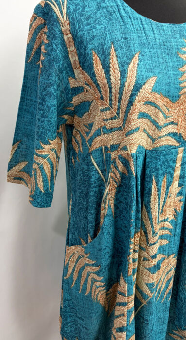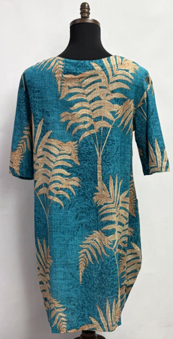Orientique ~ Ponta Verde Fern, Elbow Sleeve Dress #A62D4 Simple, elegant, organic cotton summer dress Round neckline Elbow sleeves Shorter length lands below the knee Two generous front pockets Roomy fit Fabric: 100% Organic Cotton Machine wash cold, gentle tumble dry Sizes: M-2X $89.95 #A62D4