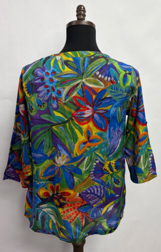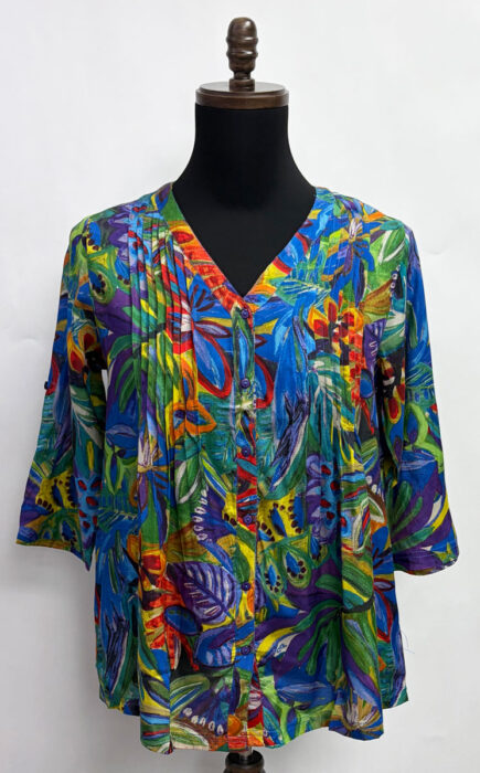 Orientique ~ “Zapallar” Pleated Top #A62T8 Lightweight, soft sustainable rayon summer shirt Colorful “Zapallar” print in bold hues Pin-tuck pleated front V-neck 3/4 Sleeves Full front button Fabric: 100% Sustainable Rayon Gentle machine wash cold, tumble dry low Size: M-2X $89.95 #A62T8