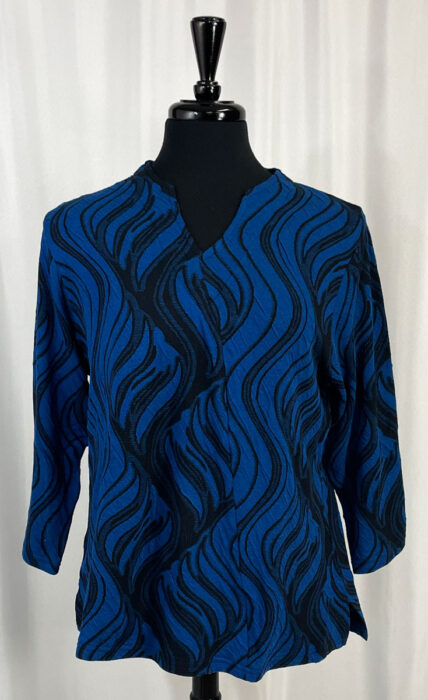 Parsley & Sage ~ Paxton V-neck #ZF173T14 SOFT, notched v-neck Top Paxton ~ Blue and Black wave pattern 3/4 Sleeves Tunic length – with flattering a-line cut Denim friendly! 55% Cotton, 40% Rayon, 5% Spandex Machine wash cold, tumble dry low SIZES: L – 3X PRICE: $ 69.95 #ZF173T14