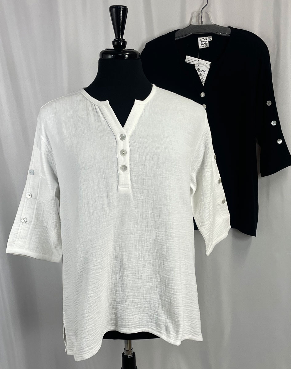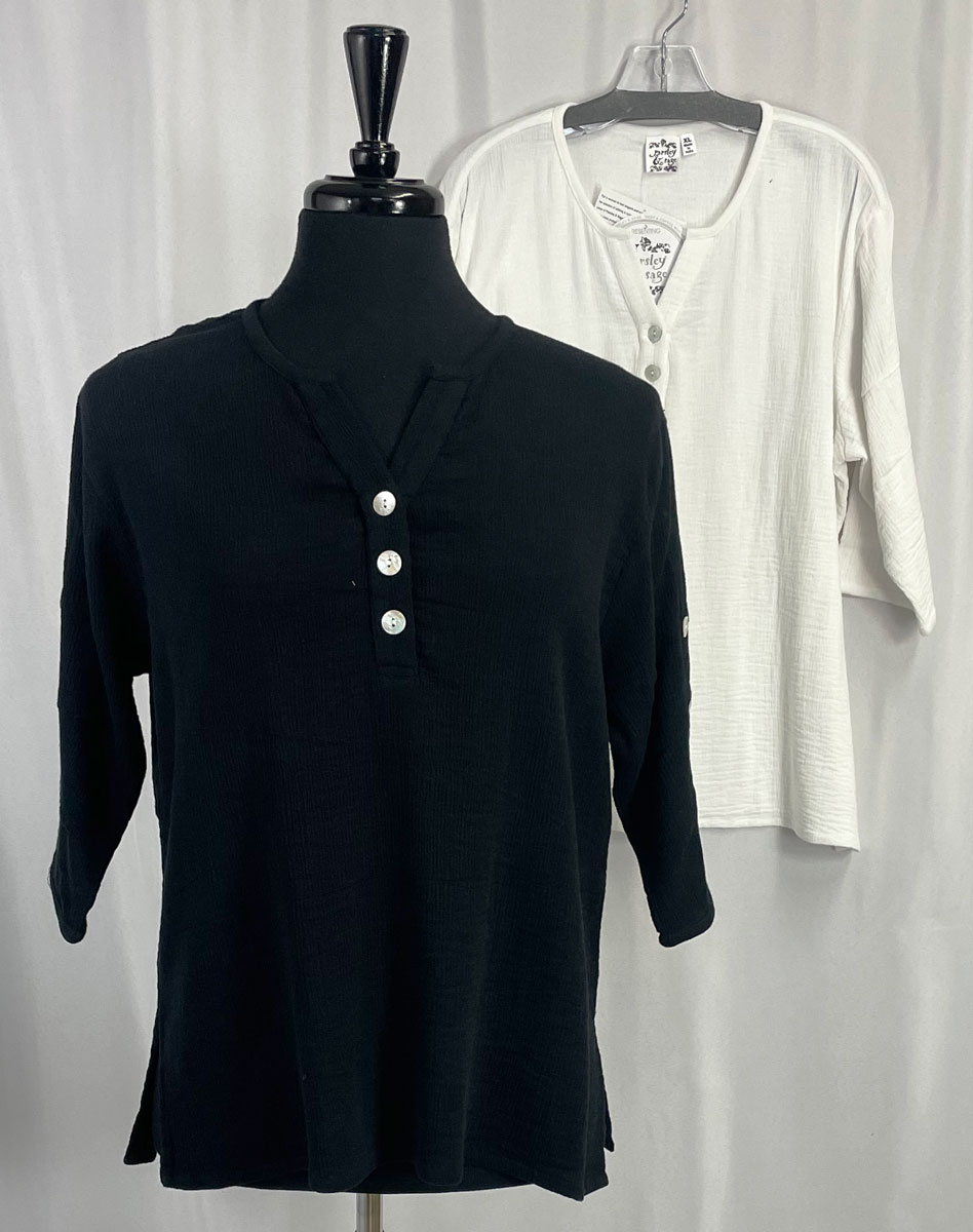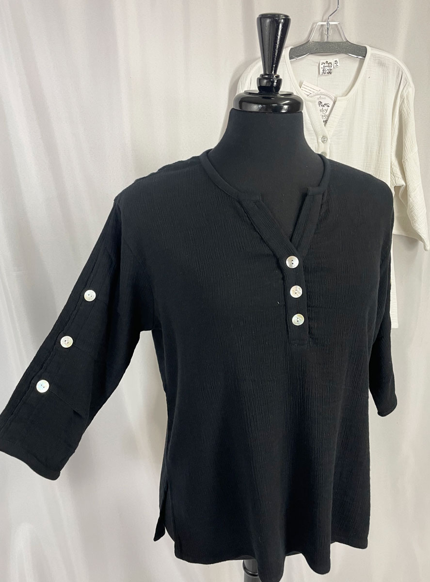 Parsley & Sage ~ Sharon Cotton Gauze Top (2 Colors) #ZB173T1 3 button front, soft cotton gauzeshirt V-neck with buttons Pearlescent buttons 3/4 sleeves with buttons Tunic length with side split Available in 2 colors: Black or White Fabric: 100% Soft Cotton Machine wash cold, tumble dry low Sizes: M-3X $59.95