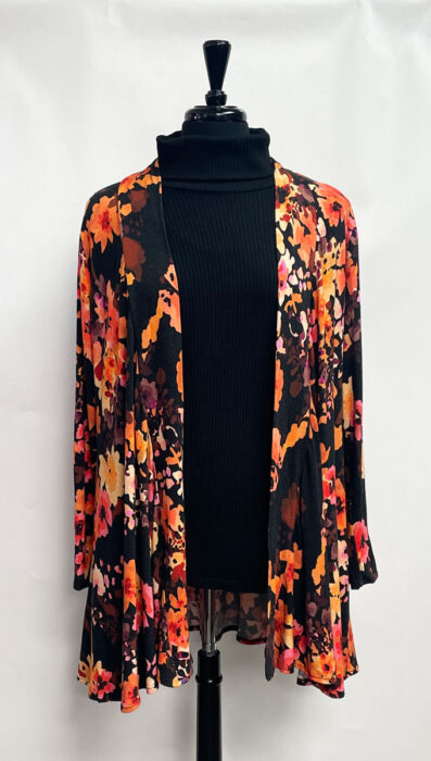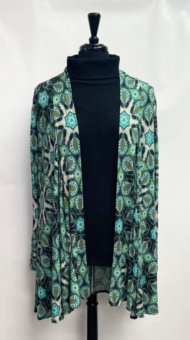 Salaam ~ Open Cardi Sweater #Z66T1 Warm, cozy and stylish open cardigan Long-sleeve Comfortable and elegance. Super soft & comfortable 2 Prints: Orange Black, Green Black Fabric: 97% Viscose, 3% Elastane Made in the USA Machine wash cold, hang dry Sizes: M-XL $119.95