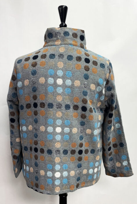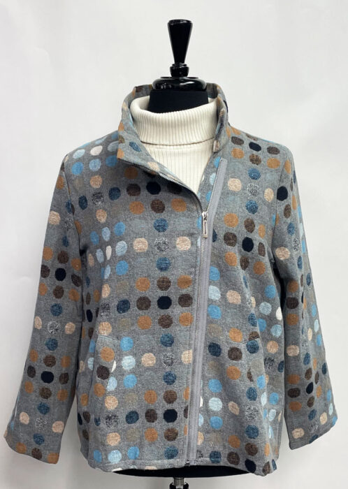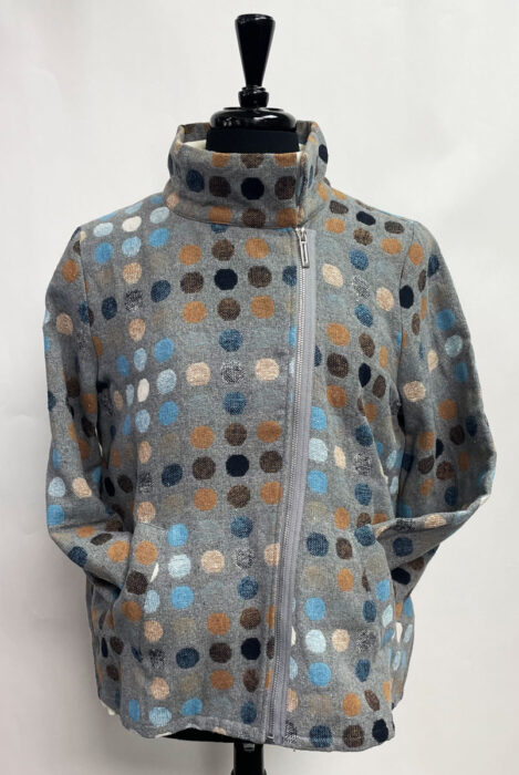 Full length diagonal zipper and moc-neck give this a unique and stylish look